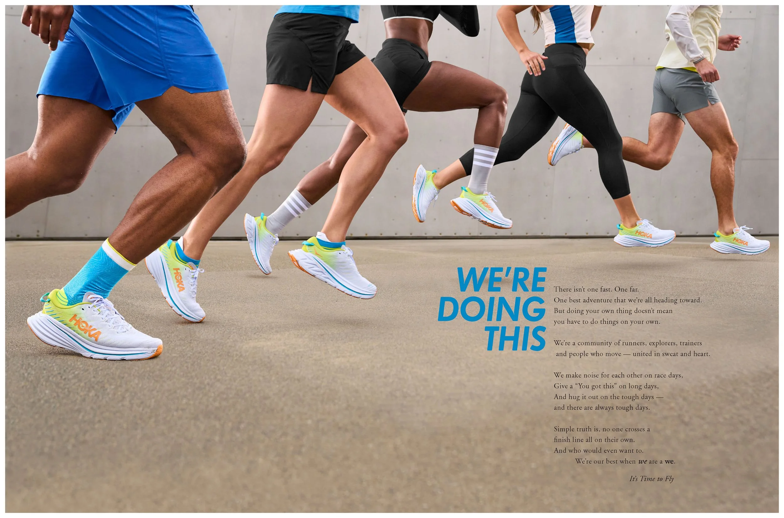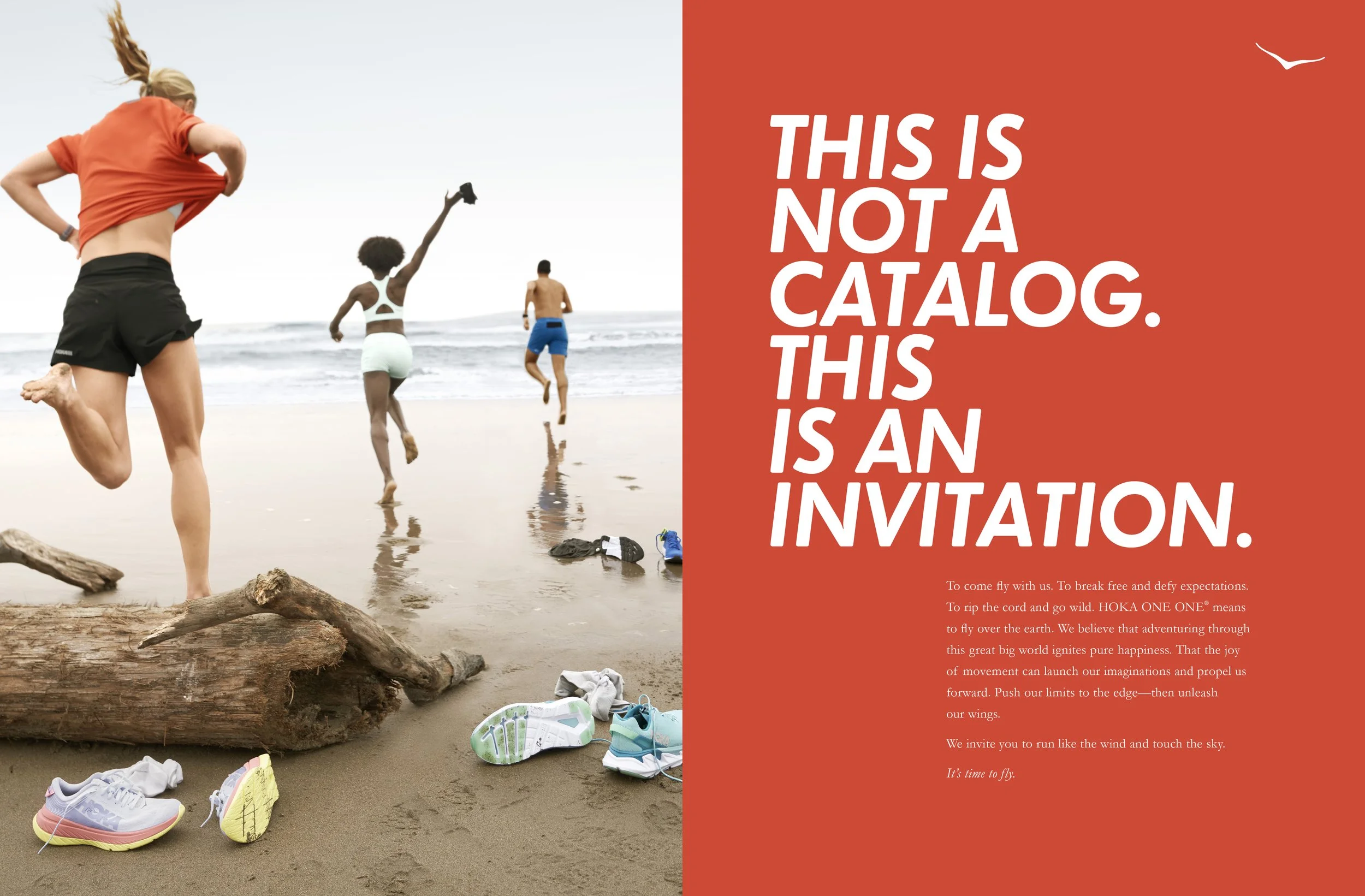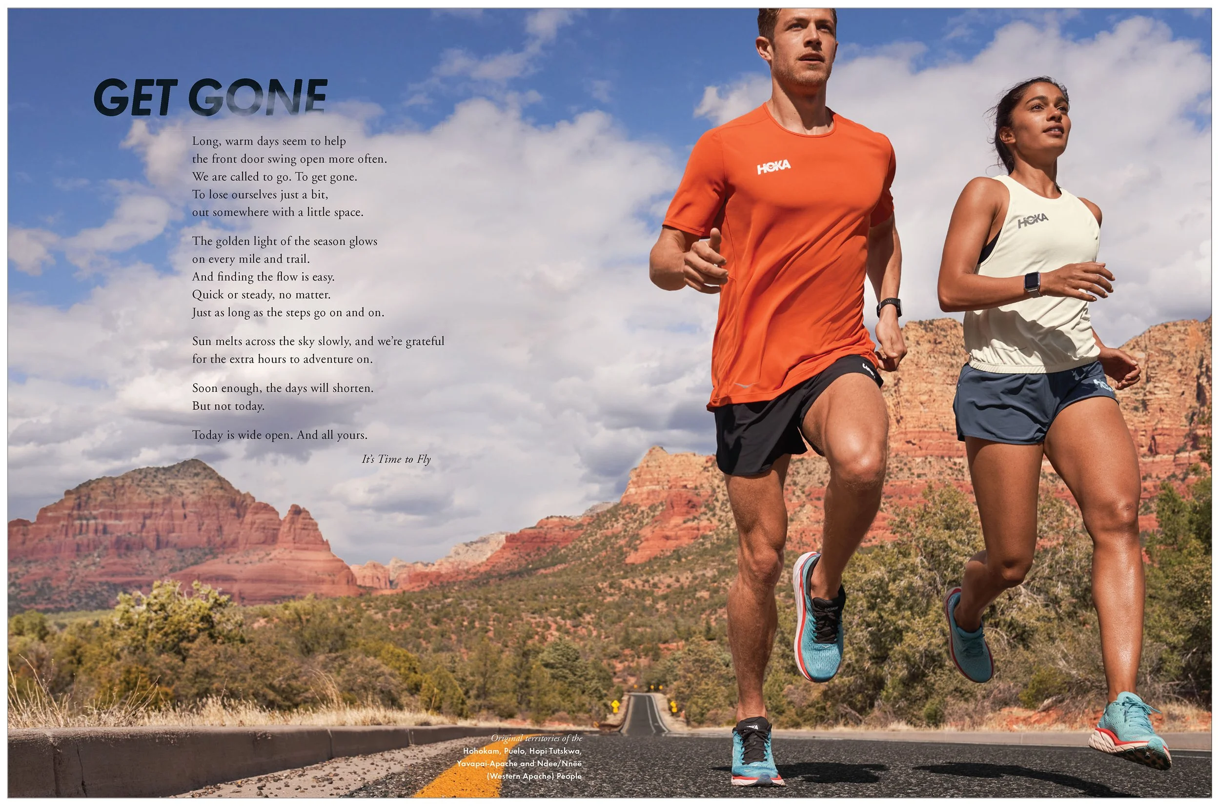 For HOKA, a brand that celebrates the joy of movement, it seemed fitting to lead each season with emotion on our cover and pay off with motion inside. The covers captured joyous moments just before, after or in-between a run and then invited you to turn the page and continue the story inside. The opening message always spoke like a friend – in a familiar, optimistic and warm tone – encouraging us to pursue the limitless possibilities that exists in all of us. I still reread these openers from time to time as a little pick-me-up and they always succeed in making me feel a little stronger, more resilient, and wanting to get outside and fly…